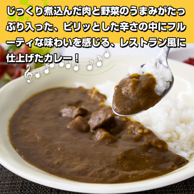 ■原材料:野菜(馬鈴薯、人参)、小麦粉(国内製造)、ボイルドビーフ、食用油脂、肉エキス、ソテーオニオン、チキンブイヨン、砂糖、カレー粉、バター、トマトケチャップ、アップルソース、ウスターソース、食塩、チャツネ、澱粉、香辛料/調味料(アミノ酸等)、カラメル色素、酸味料、香辛料抽出物、香料、(一部に小麦・乳成分・牛肉・大豆・鶏肉・りんごを含む)